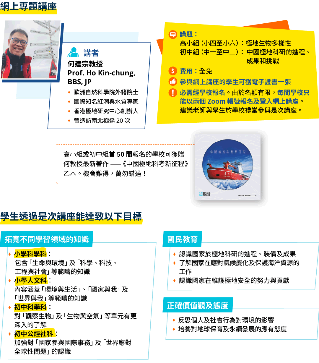 聯合培進教育出版與香港極地研究中心合作,透過舉辦是次講座,希望讓更多學生認識極地生物多樣性和國家在極地科研的貢獻,同時反思如何為地球可持續發展出一分力。