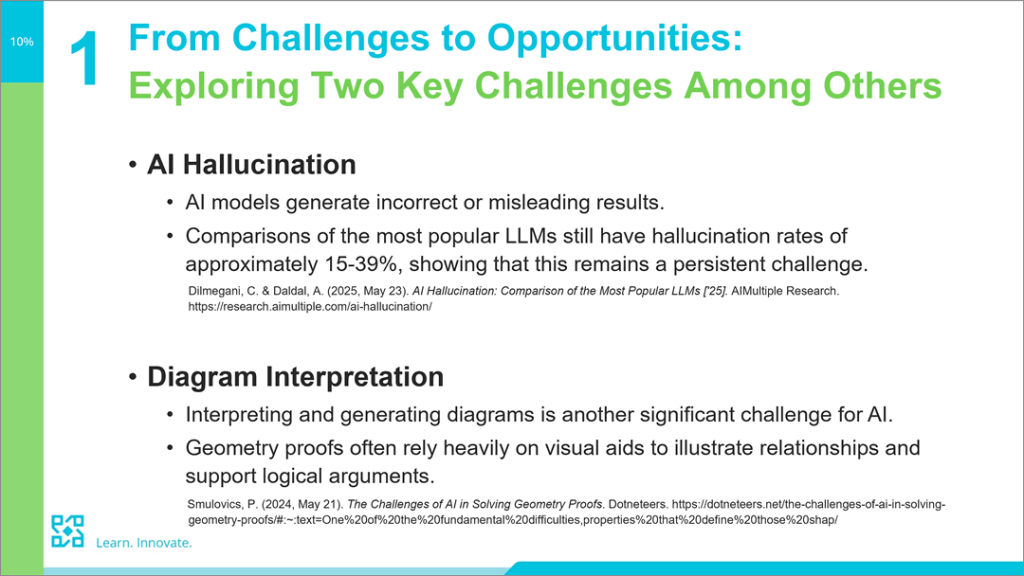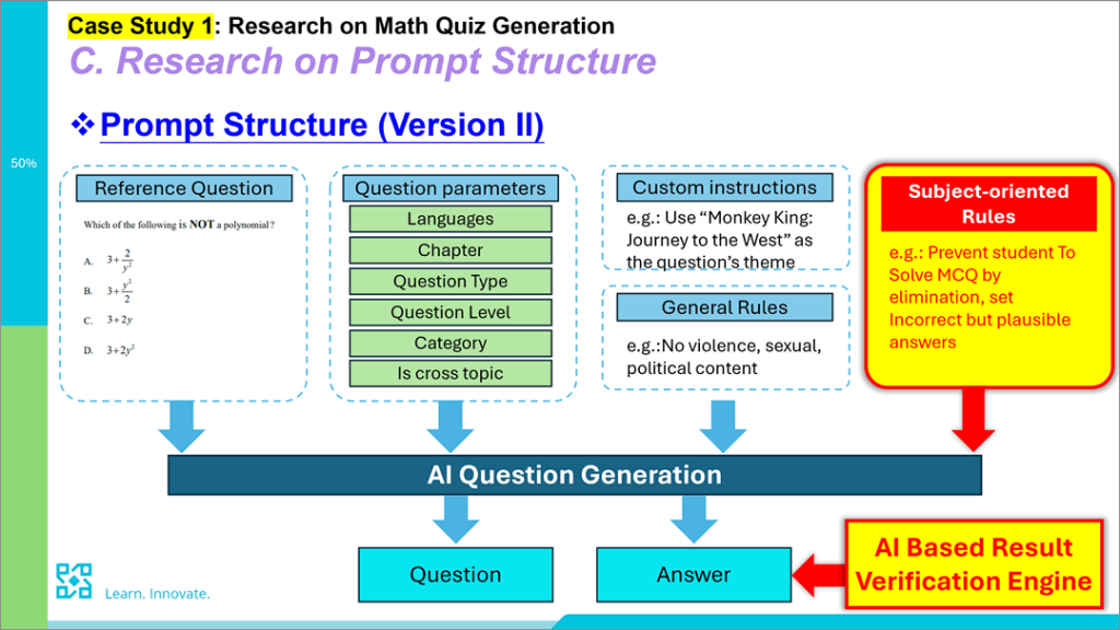 李Sir提到,將人工智能應用於數學教育產品的開發存在兩個主要挑戰:其一是人工智能幻覺(A.I. hallucination),其二是對圖表與數學符號的解讀能力有限。以生成數學題目為例,他使用多種大型語言模型(LLMs)並採取不同指令(prompt)進行測試,結果顯示這些模型的表現參差不齊。即使表現相對較好的模型,在生成數學多項選擇題的答案選項時仍顯得不足。由此可見,要克服這些問題,仍需要資深的數學教育工作者為人工智能設計多種認知系統(Cognitive System),從而完善人工智能在數學教學中的應用。