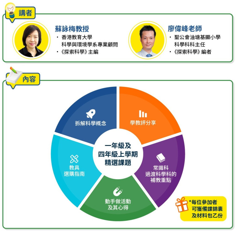 小學科學科推行在即,為協助老師及早備課,特設是次工作坊,邀請專家及資深老師剖析上學期重點課題及新增課題,幫助大家輕鬆迎接新學年。